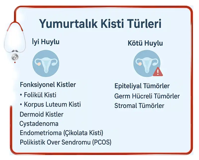 Kistler genellikle iki ana kategoriye ayrılır: iyi huylu yumurtalık kisti (benign) ve kötü huylu yumurtalık kisti (malign).